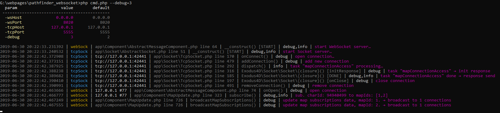 $ php cmd.php --wsHost [CLIENTS_HOST] --wsPort [CLIENTS_PORT] --tcpHost [TCP_HOST] --tcpPort [TCP_PORT] --debug 0