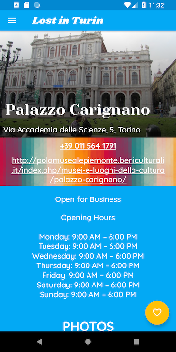 This is the landing page where the user after allowing location permissions, sees his position on the map and can search for places in his surrounding area (in a radius of 1500m). By clicking on one of the markers he or she can check infos about the place (name and address) and then with a furter click can access the detail page of the object selected with place reviews, photos, website address and if available opening times.