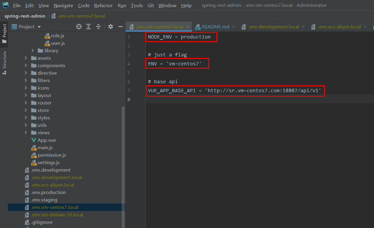 注意: 除了开发环境配置 .env.development 和 .env.development.local 以外,其它环境配置文件都需要设置 NODE_ENV = production ,环境名 ENV 需要与 环境配置文件名中 .env 与 .local中间的部分对应,另外,接口调用地址前缀 VUE_APP_BASE_API 也要记得修改。