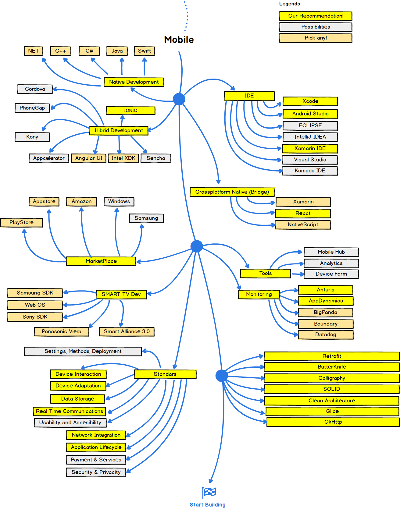 Below you find a set of charts demonstrating the paths that you can take and the technologies that you would want to adopt in order to become a frontend, backend or a devops. I made these charts for an old professor of mine who wanted something to share with his college students to give them a perspective.